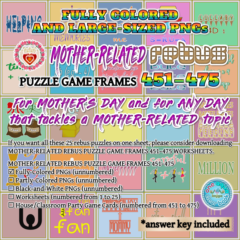 Fully Colored MOTHER-RELATED Rebus Puzzle Game Frames 451–475 PNGs